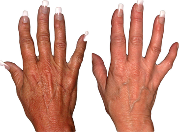 One can work wonders with the face, the jowls, the neck, and even the chest. It is often the hands that give the game away!. The skin of the hands undergoes constant use and abuse. The skin goes on to develop a rougher texture, fine and not-so-fine wrinkles appear, exacerbated by the loss of subcutaneous tissue. This exposes the vessels and the hands can look “bony”. Some changes of aging one cannot improve by very much: arthritic fingers, nodules, and such are almost impossible to improve or camouflage.