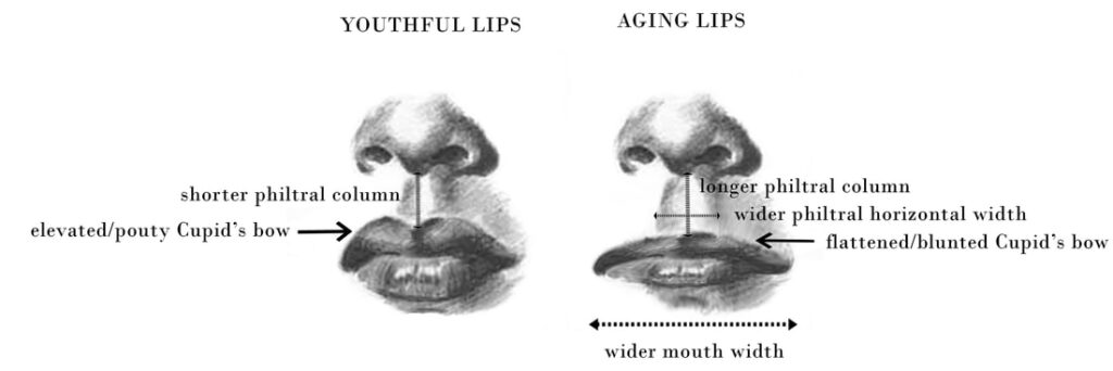 The youthful fullness of lips and the upward corners are universally admired and desired. Slow loss of fullness, the downward slope to the angles of the mouth, vertical lip lines (often called “smokers’ lines even when present in non-smokers), the loss of what I have called the “earthworm” that sits on every youthful lip, resulting in loss of the definition of the lip, the loss of definition of the cupid’s bow, the loss of the vertical philtral columns and associated inter-philtral hollow, and the loss of the proportions of the upper and lower lips all conspire to make the lips look not-so-youthful! ​