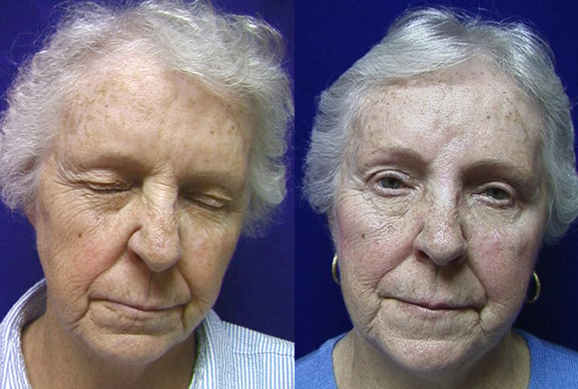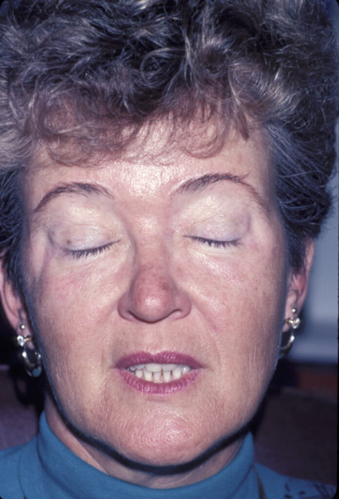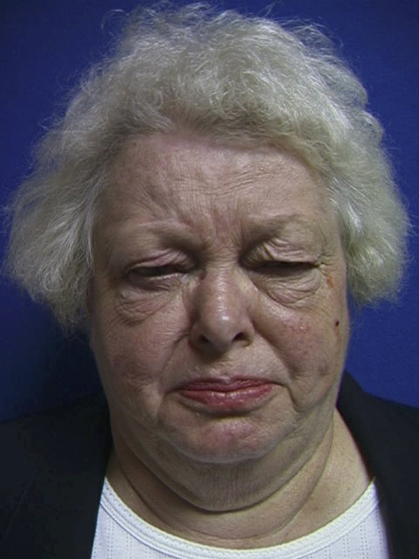 ​Before (left) and after surgery for blepharospasm. Patient underwent endoscopic brow lifts, endoscopic weakening of the corrugator and procerus muscles, blepharoplasty with ptosis repair and limited myectomy, lower eyelid elevation and tightening, minimal lower myectomy (to prevent lower eyelid retraction and ectropion), and cheek elevation to support the lower eyelids.