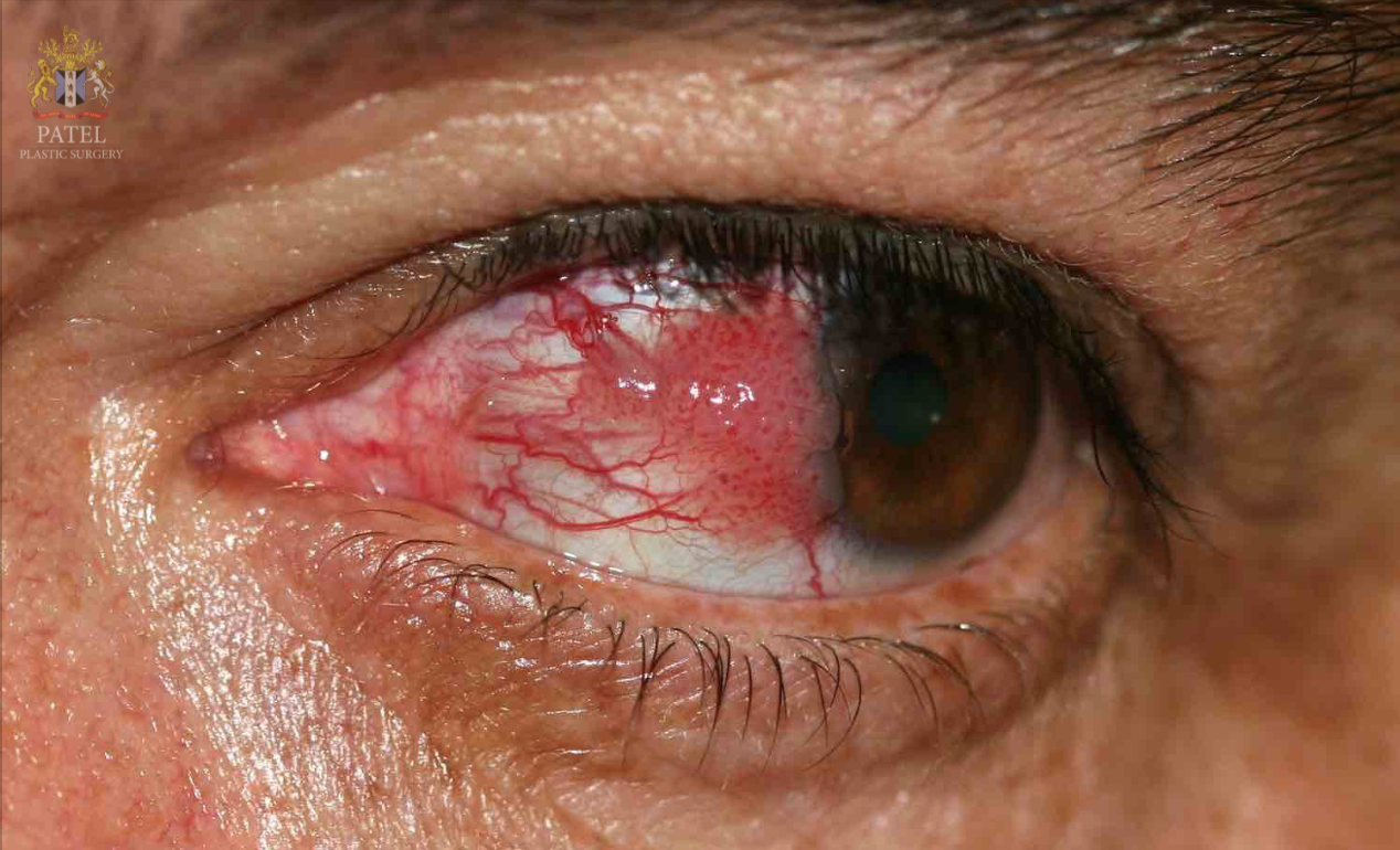 Most of the lesions grow on the nasal conjunctiva in the interpalpebral fissure. The lesions involve the conjunctiva initially and may extend onto the cornea. The lesions will show elevation, a fibrovascular growth with markedly dilated vessels and pigmentation is common in the African population.