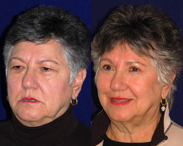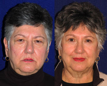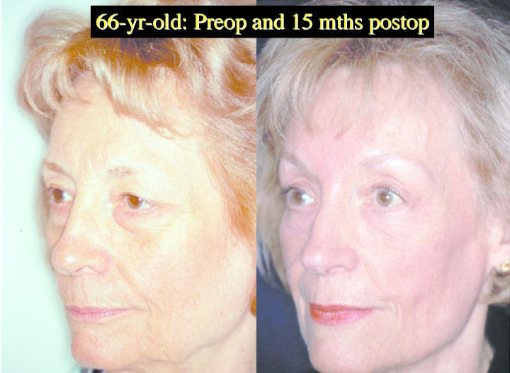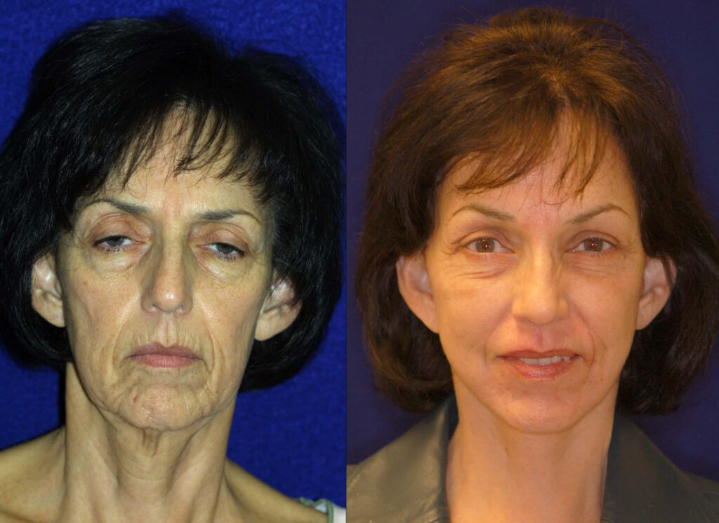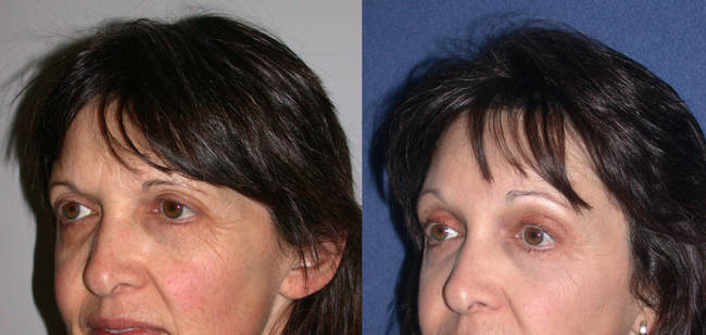 Not everyone needs or benefits from a browlift. Those that have a significant degree of horizontal forehead furrows, together with brow descent and frown lines are helped the most. In ladies, changing the shape of the brow can lead to a very elegant and refined appearance. In most patients, it is possible to show you the type of result one would be aiming for. Of course, this is not an exact science, but more of an art form. A browlift is rarely performed by itself. Upper and lower blepharoplasty and other procedures are often undertaken at the same time. To the right is a patient who underwent a browlift with upper and lower blepharoplasty with a “Hammock Lift” which gave her a very pleasing overall improvement without undergoing a facelift.