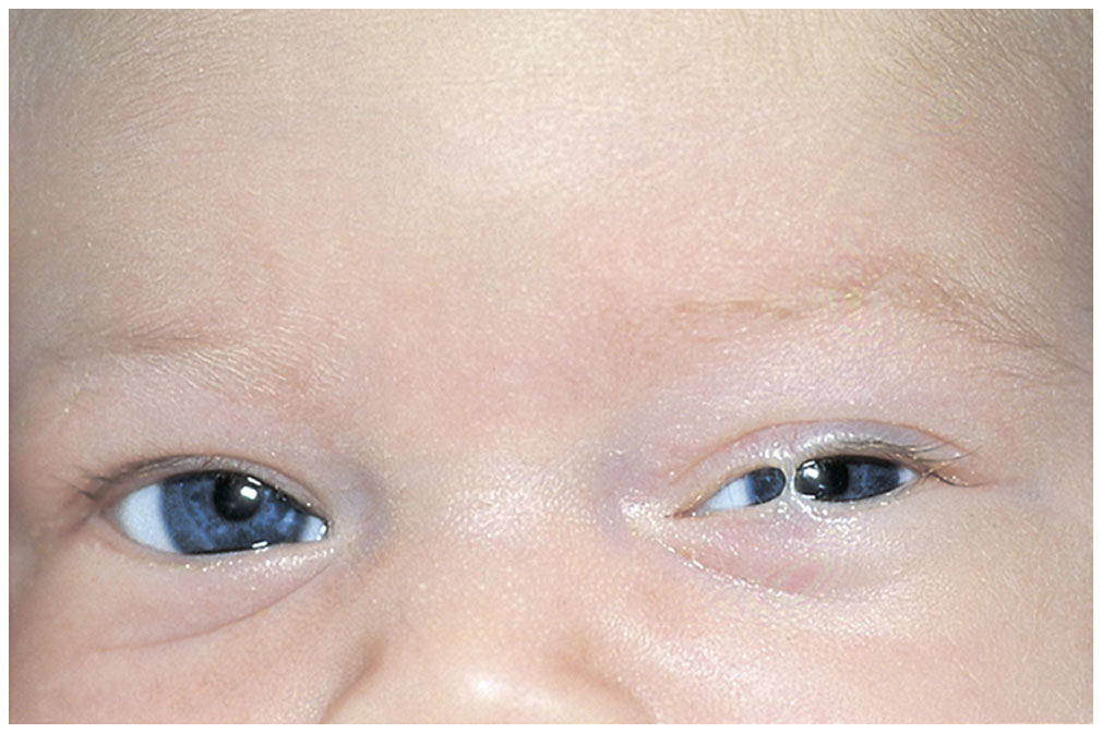 - Child is born with the upper lid bent backwards often with a 180 degree fold in the upper tarsal plate