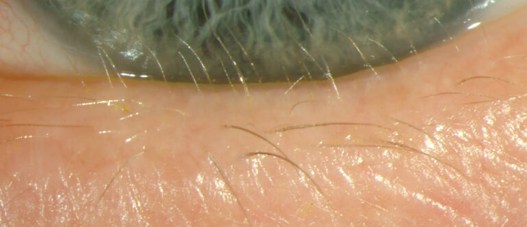 An accessory row of lashes growing from the meibomion orifices or posteriorly.