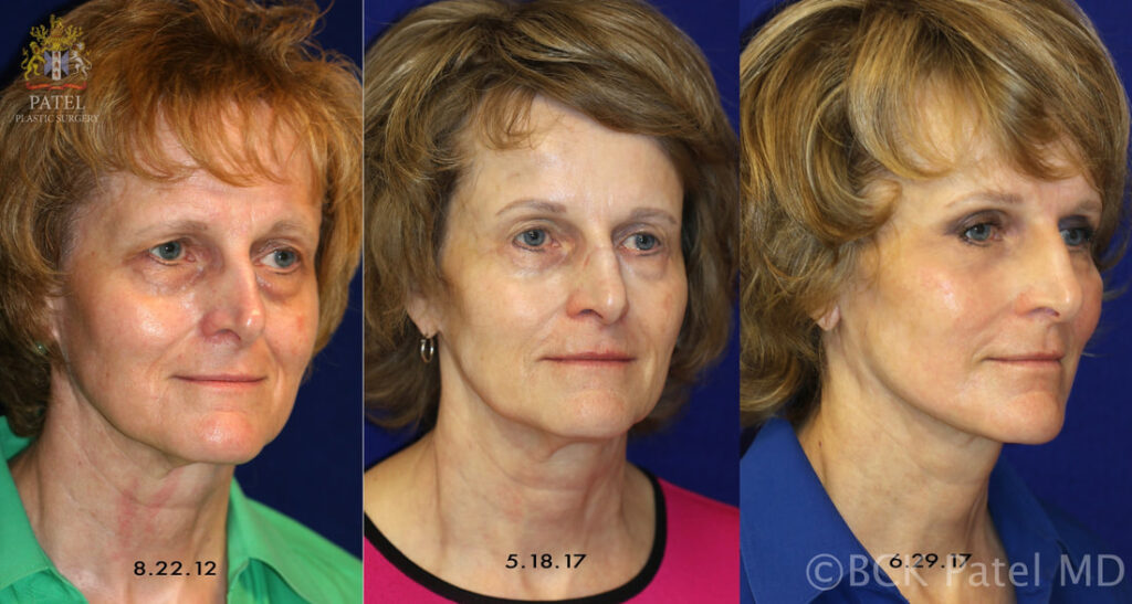 It is vital to review photographs from younger days. In particular, we would like to see photographs where you think the face, the jawline and the neck look the best. An examination of the skin texture, skin laxity, subcutaneous fat, excess or deficient fat, prominences, depressions and bony changes allows us to determine the type of facelift that would serve you the best. Any prior history of trauma or Bell’s palsy is taken into consideration, as is any prior surgery to the brows, eyelids or face. Based upon experience as well as predictable analysis of findings, we will give you a reliable idea of what to expect with a facelift. Our aim is to make you look younger even though you may be several years older as seen here: