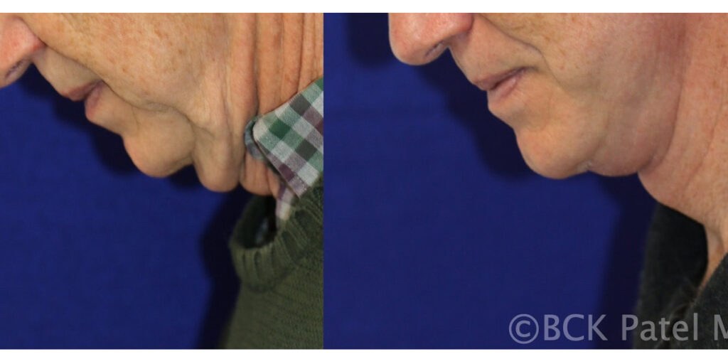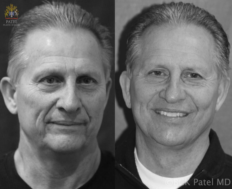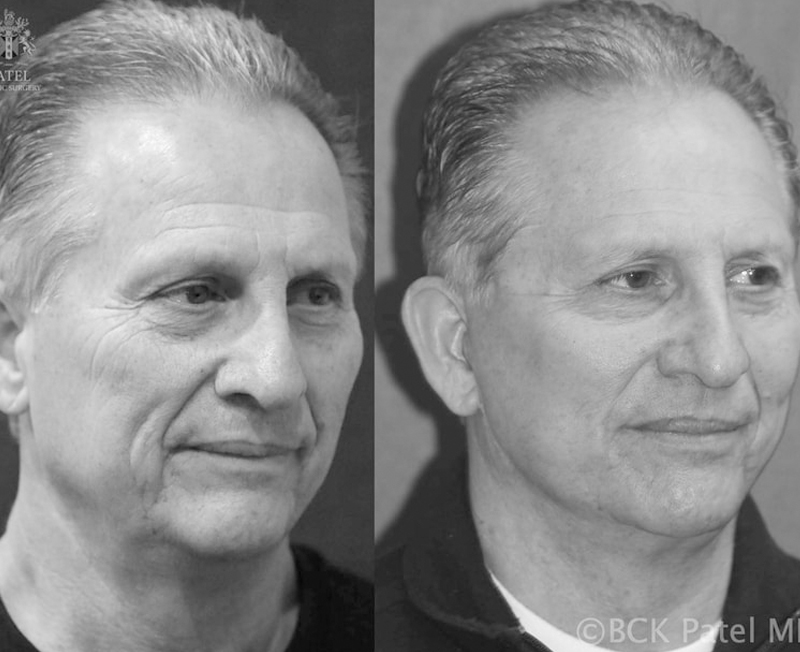 A comprehensive assessment of changes allows an accurate plan to be made. The aim is to leave one looking natural, just more youthful. This gentleman had Dr. Patel’s trademarked procedure “The Hammock Lift” with no facelift. All the improvements seen are from this Hammock Lift