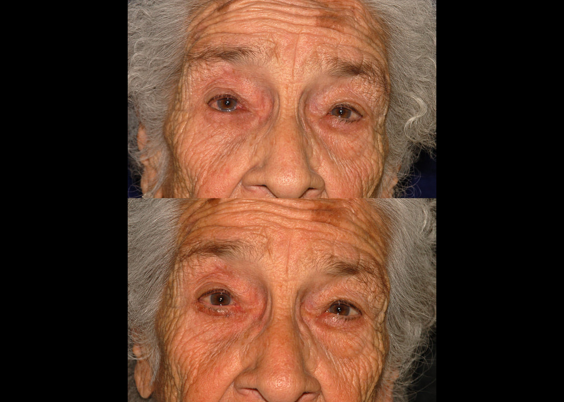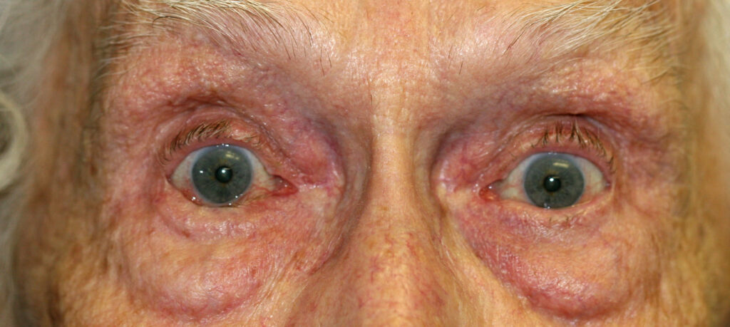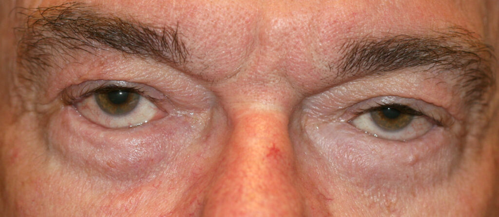 Notice the “bulge sign” on the right lower eyelid which is turning in