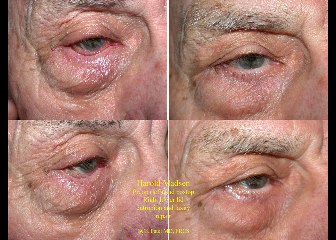 In-turning lower eyelids causes the eyelashes to rub against the corneas causing pain, tearing, discharge and blurry vision. The first sign of an entropion is intermittent irritation and tearing, usually when a patient first wakes up. This is because in our sleep, the lax lower eyelid has a tendency to turn in and we wake up with the irritation. Once you pull the lower eyelid down, at least in the early stages of this condition, the eyelid will sit in a relatively normal position and intermittently turn in, especially when you squeeze your eyelids. Dr. Patel described the “bulge sign” which is a bulge across your lower eyelid which is not present on the normal opposite side. This allows doctors and technicians (and patients!) to make the diagnosis when they suffer from intermittent irritation.