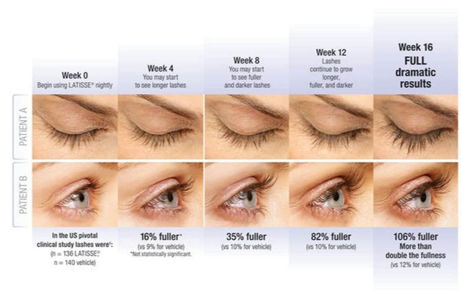 Within 3 to 4 months of using Latisse, your eyelashes will be fuller, longer and darker. Research shows that 78% of Latisse® patients showed significant improvement in length, thickness and darkness by 8 weeks.